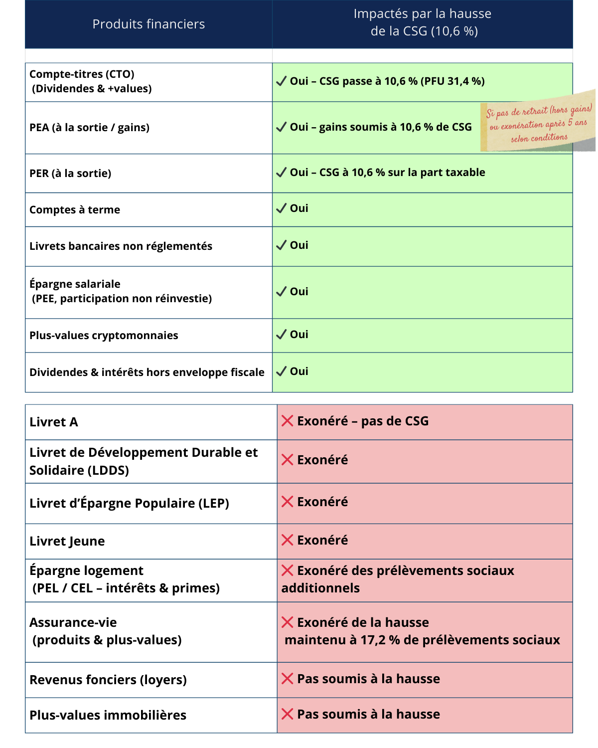 Voici un tableau simple et lisible, montrant les produits concernés par la hausse de la CSG (9,2 % → 10,6 %) au 1ᵉʳ janvier 2026, et ceux qui en sont exclus.